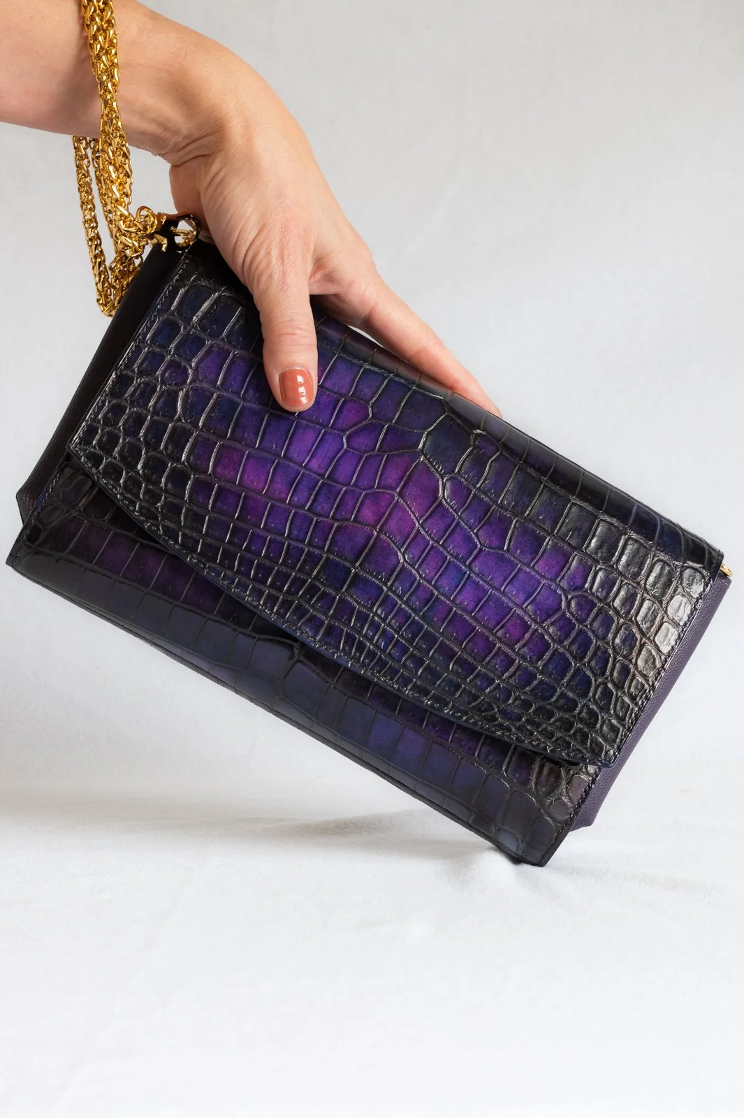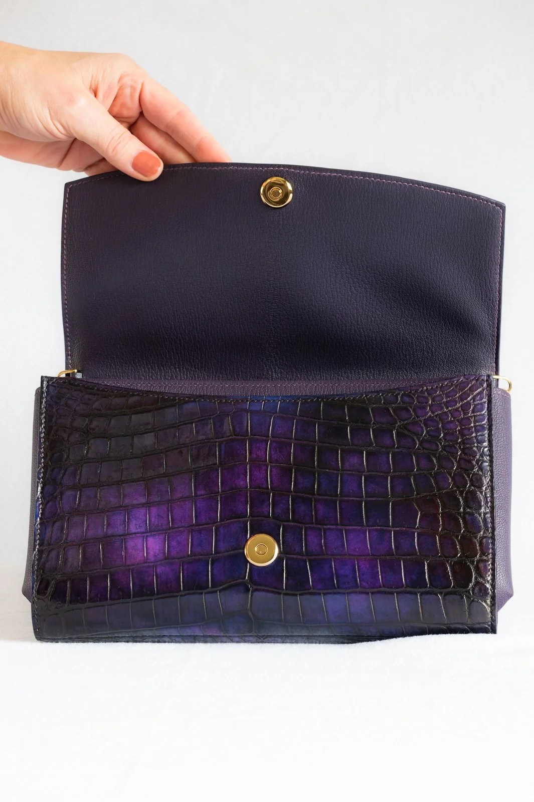 This one-of-a-kind April bag was crafted from un-dyed Nile crocodile, which was then hand-dyed and patinated by Han Core Lab in New York. A rich royal purple, it glows like stained glass, with areas of sapphire blue and garnet. It sports the unique gussets of the April, with a double gold chain that can be converted for wristlet carry. One large exterior pocket; one small interior card pocket. A stunner.